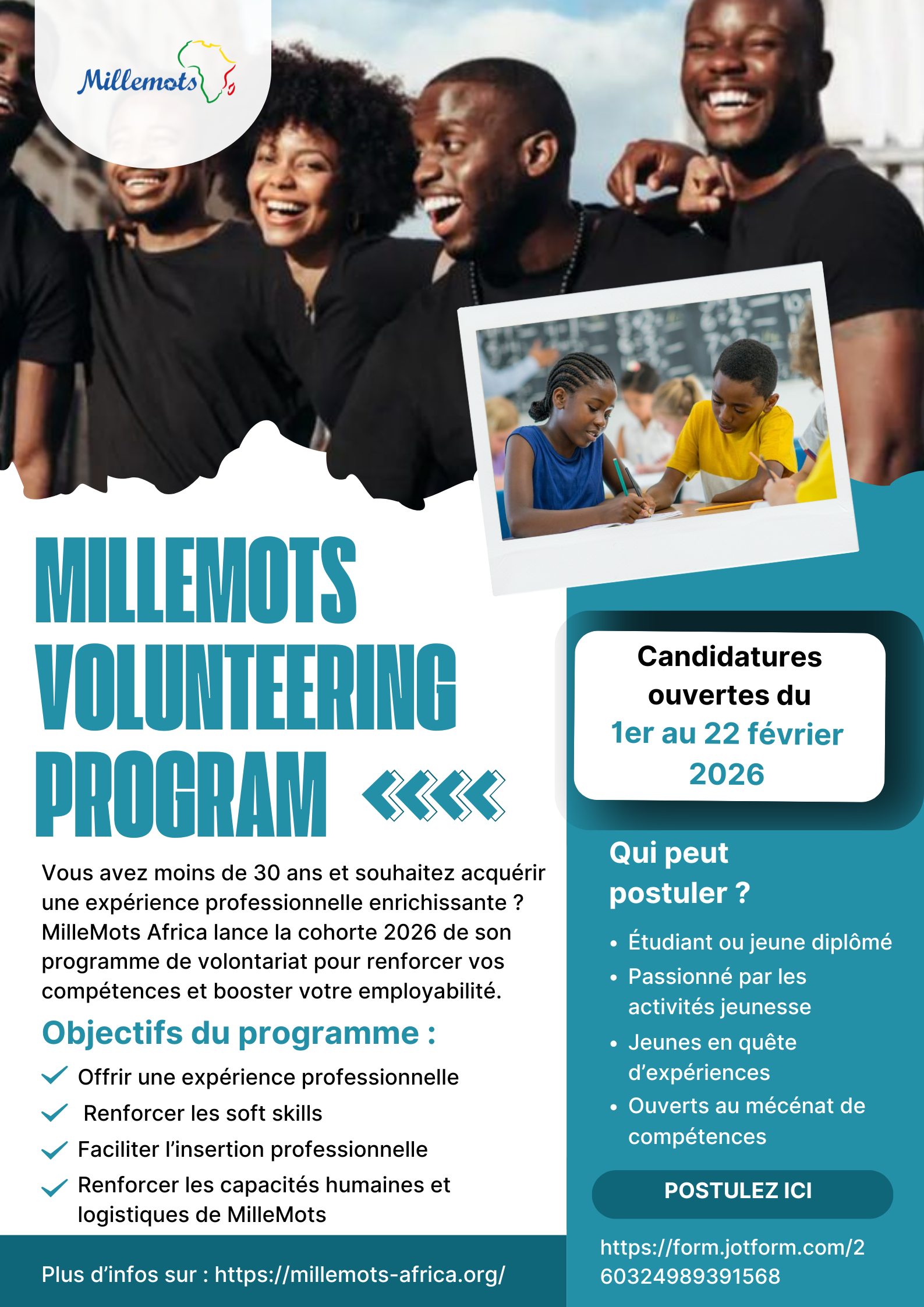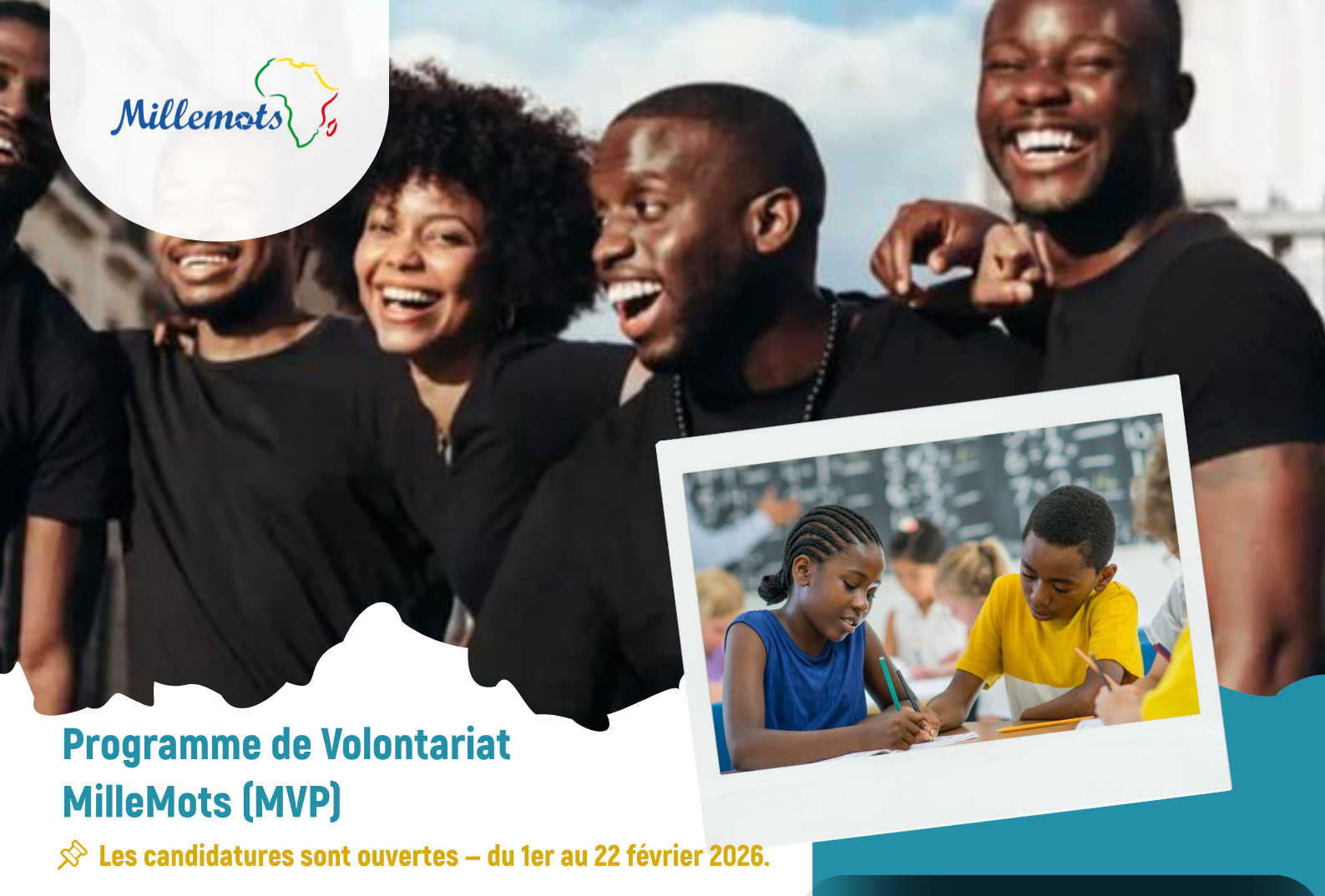 MilleMots Africa ouvre officiellement les candidatures pour la cohorte 2026 de son Programme de Volontariat MilleMots (MVP) au Bénin : un parcours annuel hybride (présentiel & distanciel) pensé pour les jeunes Africains de moins de 30 ans qui veulent apprendre, contribuer et accélérer leur employabilité.